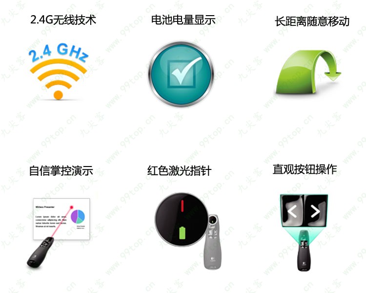 功能:(红)激光、上翻页、下翻页、全屏、黑屏、电池开关